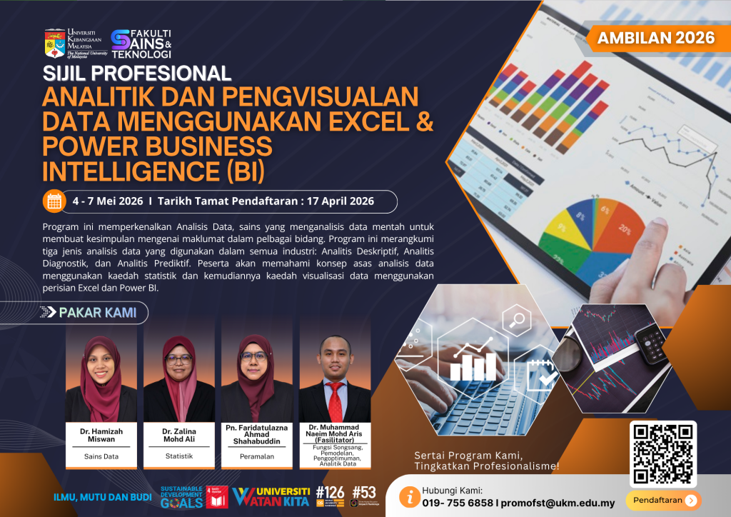 Program ini memperkenalkan Analitik Data yang merupakan sains menganalisis data mentah untuk membuat kesimpulan mengenai sesuatu maklumat dalam semua bidang yang bertujuan untuk membuat keputusan dalam menjaga kepentingan awam dan kelestarian persekitaran. Program meliputi tiga jenis analisis data yang digunakan di semua industri iaitu Analitik Deskriptif, Analitik Diagnostik dan Analitik Ramalan. Program akan membincangkan pemahaman asas mengenai konsep analitik data menggunakan kaedah statistik dan seterusnya kaedah visualisasi data menggunakan perisian Excel dan Power Business Intelligence (BI). Di akhir program, pelajar berupaya untuk membina graf, carta, plot, jadual pangsi serta papan pemuka untuk menjalankan analisis dan akhirnya membuat keputusan yang berkualiti.