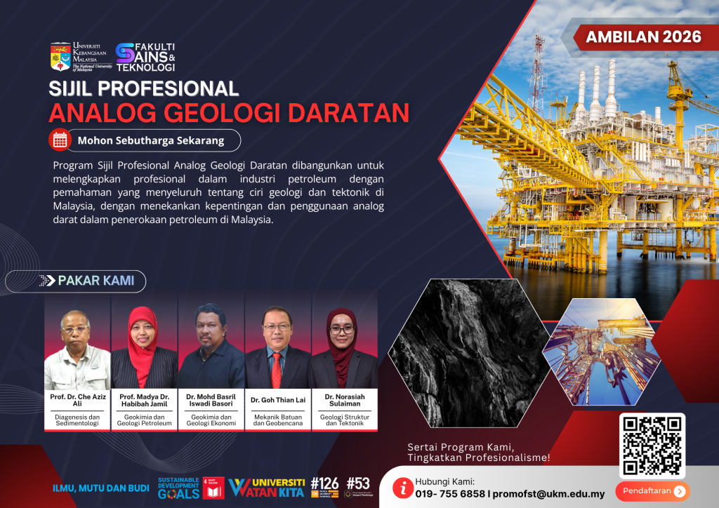 Program Sijil Profesional Analog Geologi Daratan dibangunkan untuk melengkapkan profesional dalam industri petroleum dengan pemahaman yang menyeluruh tentang ciri geologi dan tektonik di Malaysia, dengan menekankan kepentingan dan penggunaan analog darat dalam penerokaan petroleum di Malaysia.