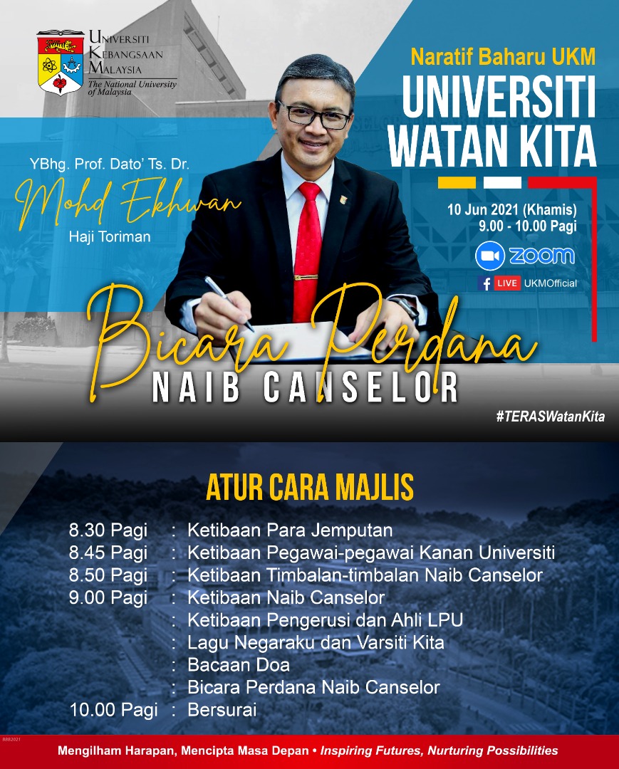 Universiti Kebangsaan Malaysia berbesar hati menjemput YBhg. Prof. Ulung/Prof./Tan Sri./Dato’/Datuk/Datin/Dr./Tuan/Puan ke Bicara Perdana Naib Canselor 2021 yang dijadualkan pada 10 Jun 2021 (Khamis), jam 9.00 pagi secara dalam talian melalui platform Aplikasi Zoom. Capaian pautan seperti berikut: