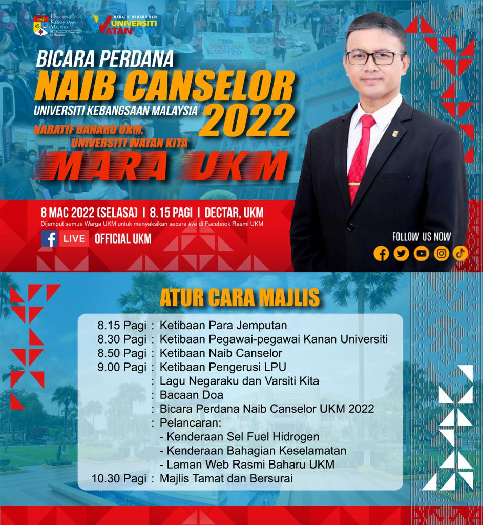 Dengan hormatnya izinkan saya merujuk perkara di atas dan memaklumkan bahawa UKM akan menganjurkan BICARA PERDANA NAIB CANSELOR UKM pada ketetapan berikut: