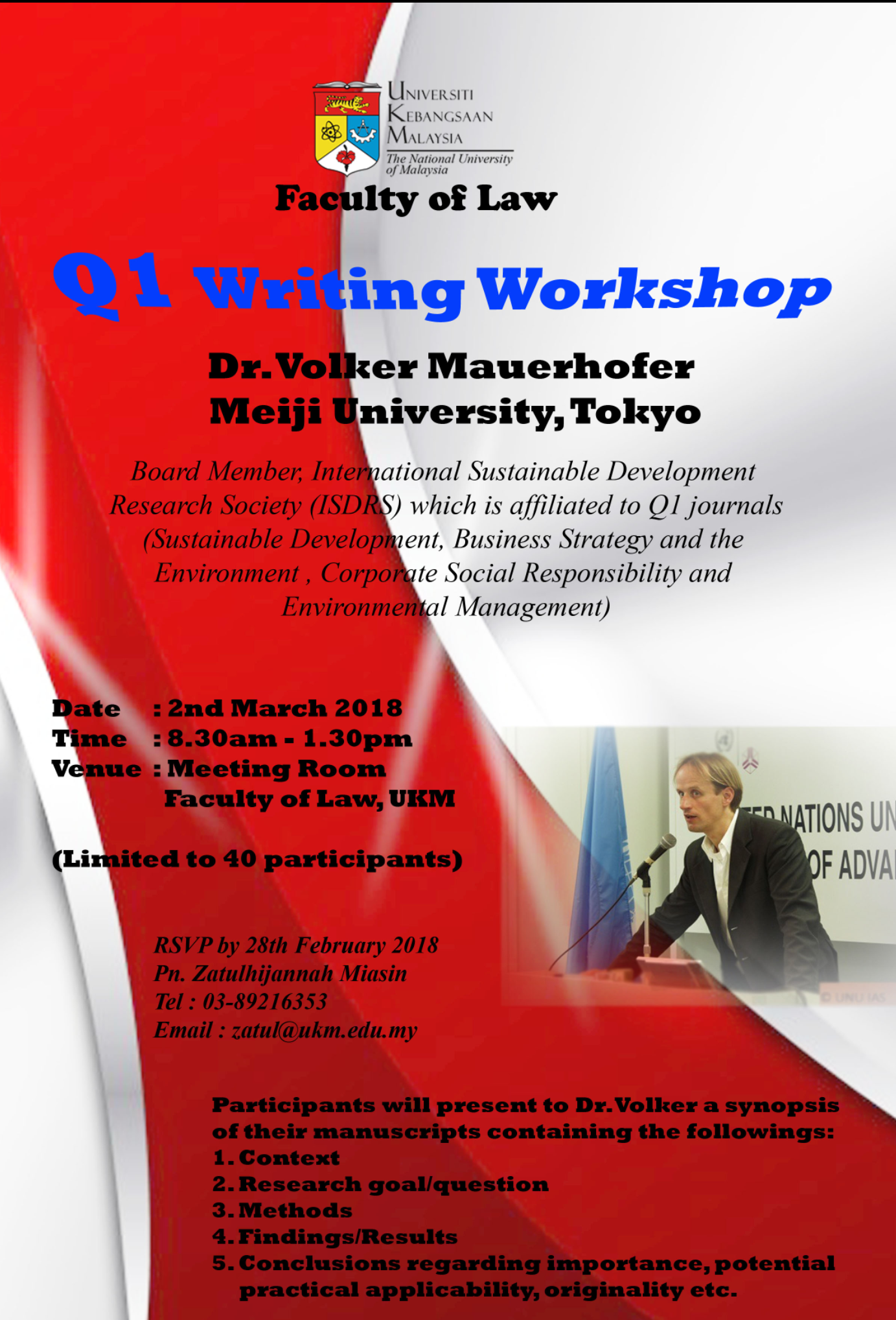 23 February 2018: The office of Deputy Dean (Research & Innovation) FUU will organised ‘Q 1 Journal Writing Workshop’ on 2nd of March 2018. The workshop will be conducted by Dr Volker Mauerhofer from Meiji University, Tokyo. The aim of the workshop is to enhance and cultivate the culture of publication so as to aim for Q1 high impact journal.