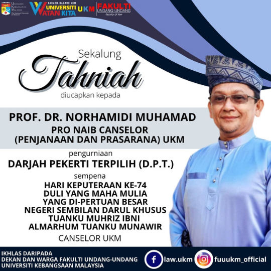 Sekalung Tahniah diucapkan kepada Prof. Dr. Norhamidi Muhammad, Pro Naib Canselor (Penjanaan dan Prasarana) UKM atas pengurniaan Darjah Pekerti Terpilih (D.P.T.) sempena Hari Keputeraan Duli Yang Maha Mulia Yang di-Pertuan Besar Negeri Sembilan Darul Khusus Tuanku Muhriz Ibni Almarhum Tuanku Munawir, Canselor UKM