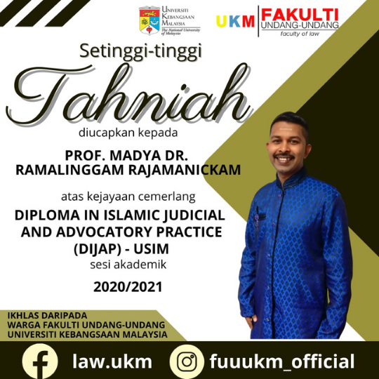 Tahniah diucapkan kepada Prof. Madya Dr. Ramalinggam Rajamanickam atas kejayaan cemerlang Diploma in Islamic Judicial and Advocatory Practice (DIJAP) – USIM sesi akademik 2020/2021