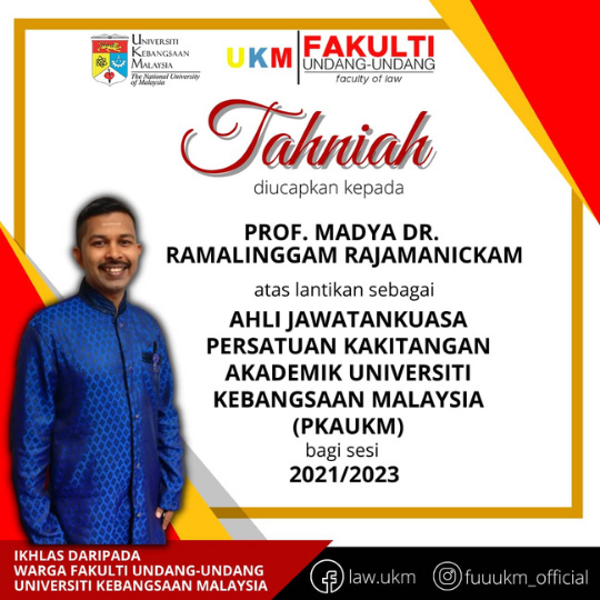 Tahniah diucapkan kepada Prof. Madya Dr. Ramalinggam Rajamanickam atas lantikan sebagai Ahli Jawatankuasa Persatuan Kakitangan Akademik Universiti Kebangsaan Malaysia (PKAUKM) bagi sesi 2021/2023