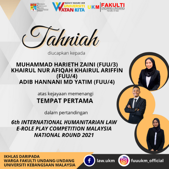 Syabas dan Tahniah diucapkan kepada pelajar FUU (pasukan A) atas kejayaan memenangi Tempat Pertama dalam Pertandingan ‘6th International Humanitarian Law E-Role Play Competition Malaysia National Round 2021’