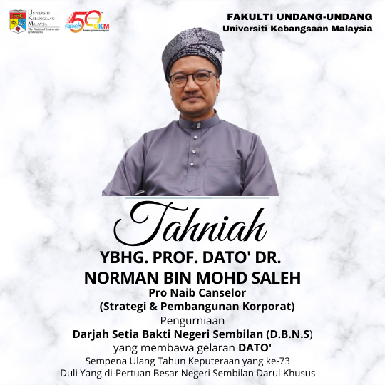 Tahniah Ybhg. Prof. Dato’ DR. Norman Bin Mohd Saleh Pro Naib Canselor (Strategi dan Pembangunan Korporat) Pengurniaan Darjah Setia Bakti Negeri Sembilan (D.B.N.S) yang membawa gelaran DATO’