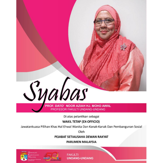 Tahniah & Syabas kepada Prof. Dato’ Noor Aziah Binti Hj Mohd Awal di atas pelantikan sebagai Wakil Tetap (Ex-Officio) jawatankuasa Pilihan Khas Hal Ehwal Wanita Dan Kanak-Kanak Dan Pembangunan Sosial