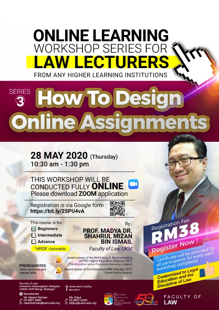 Registration Series 3 : How To Dessign Online Assingments (Online Learning Workshop Series for Law Lecturers from any Higher Learning Institutions) Date : 28 May …