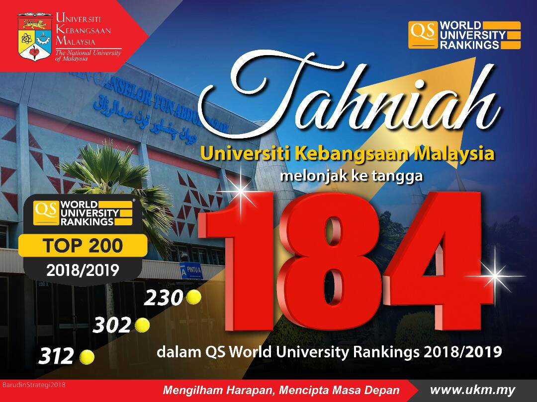 7 Jun 2018: UKM melonjak kedudukan apabila kini berada dalam kalangan 200 universiti terbaik dunia. Lonjakan yang membanggakan dari tangga 230 ke tangga 184 telah …