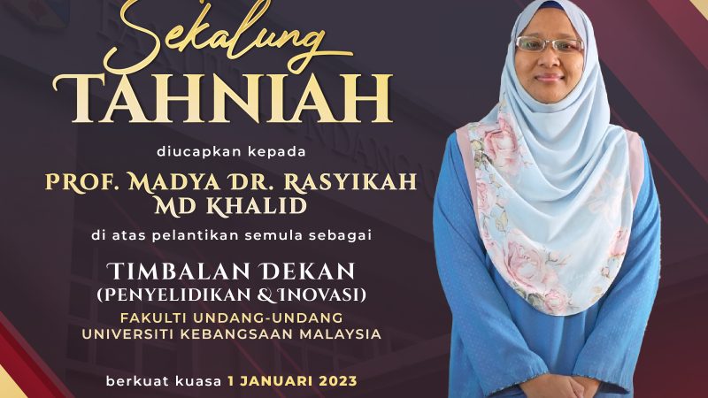 Sekalung Tahniah diucapkan kepada Prof. Madya Dr. Rasyikah Md Khalid di atas pelantikan semula sebagai Timbalan Dekan (Penyelidikan dan Inovasi) Fakulti Undang-Undang, UKM