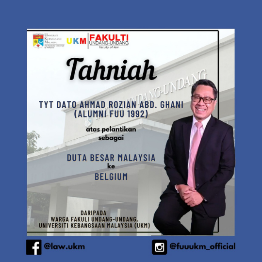 Tahniah diucapkan kepada TYT Dato’ Ahmad Rozian Abd. Ghani Alumni (FUU 1992) atas pelantikan sebagai Duta Besar Malaysia ke Belgium