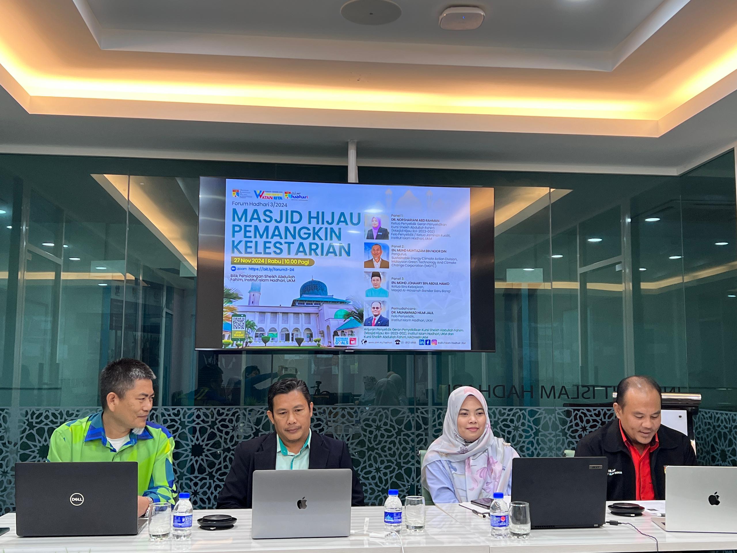 Alhamdulillah telah berlangsungnya Forum Hadhari 3/2024: “Masjid Hijau Pemangkin Kelestarian” pada 27 November 2024 (Rabu) yang dianjurkan oleh Kumpulan Penyelidik Geran Penyelidikan Kursi Sheikh Abdullah Fahim (Masjid Hijau: RH-2023-002) dengan kerjasama Institut Islam Hadhari, UKM dan Kursi Sheikh Abdullah Fahim, HADHARI UKM.