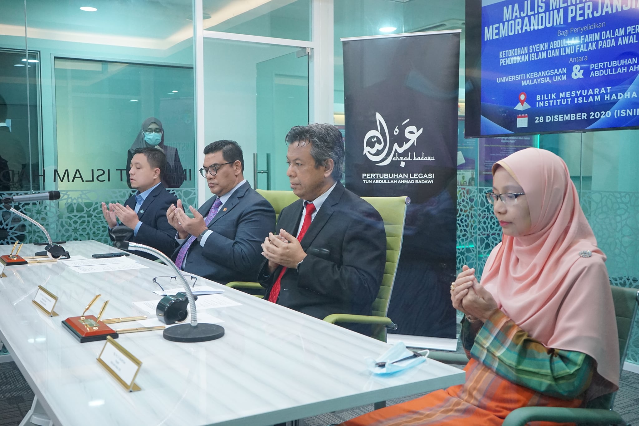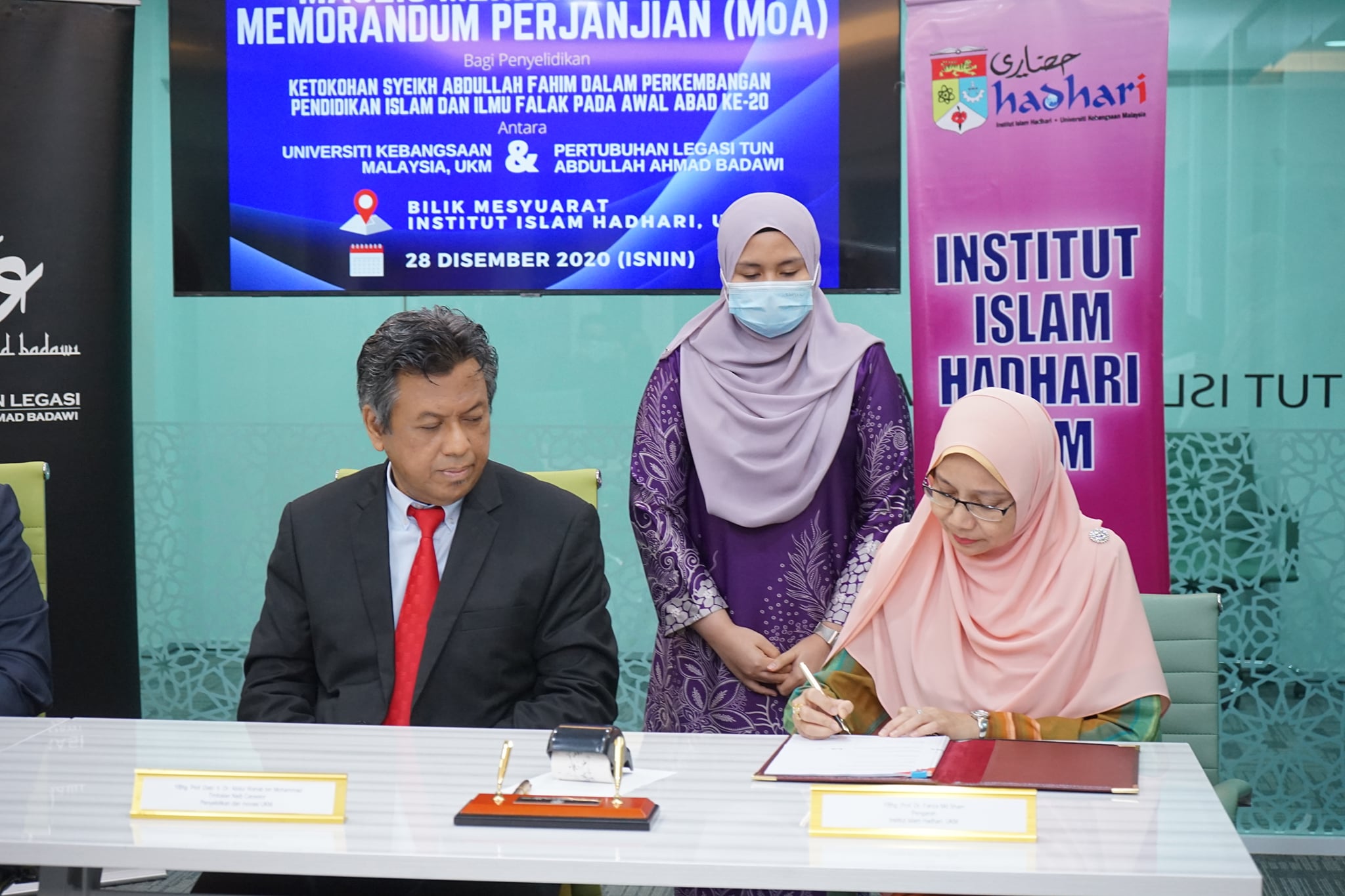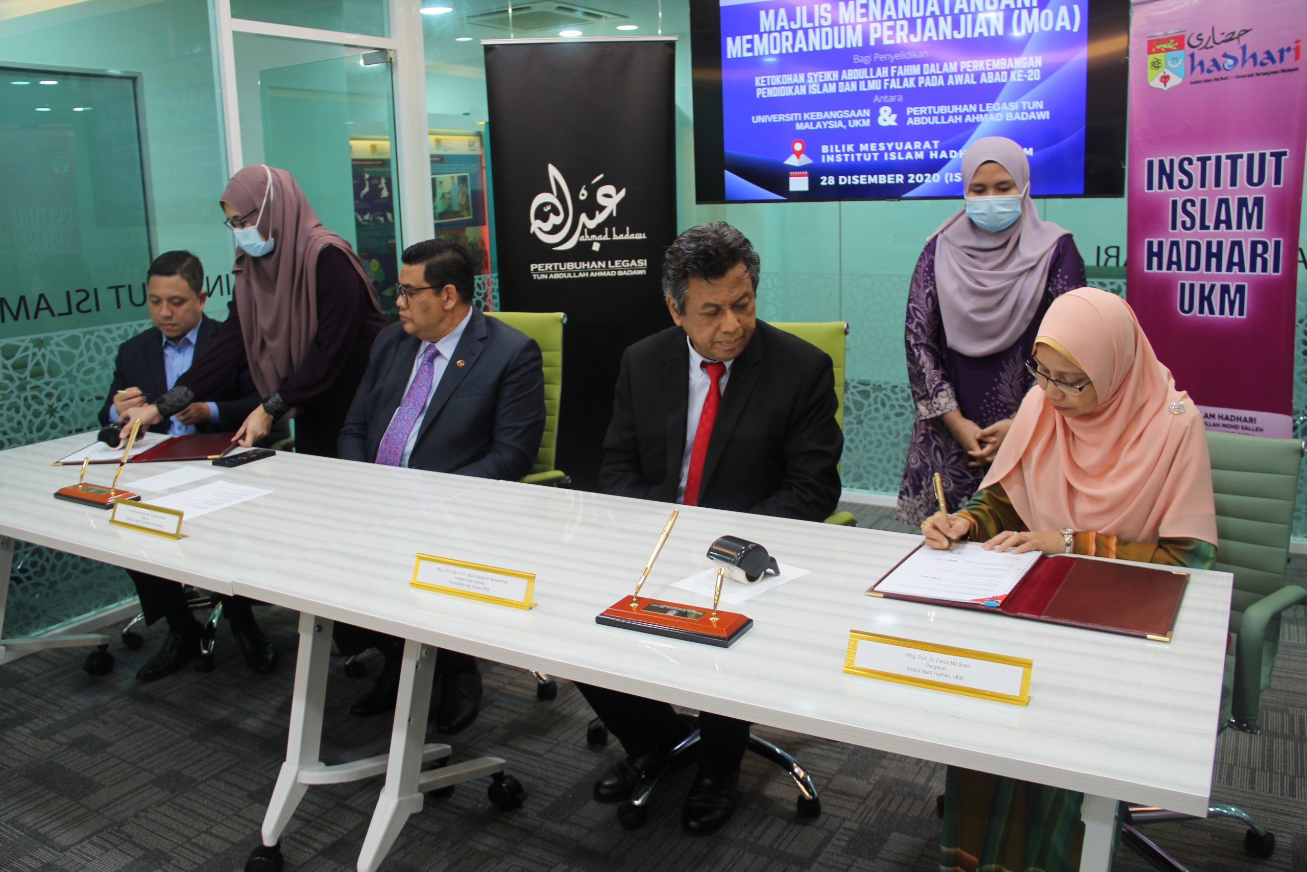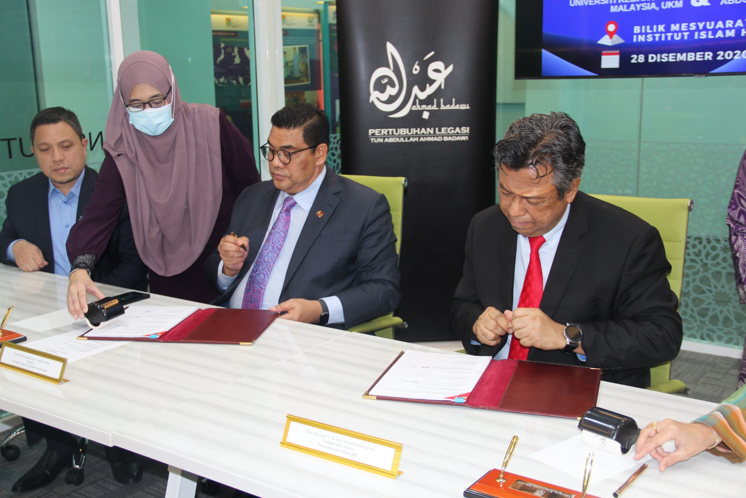 Majlis ini ditandatangani antara Timbalan Naib Canselor Penyelidikan dan Inovasi, Prof. Dato’ Ir. Dr. Abdul Wahab Mohamad dan Pengerusi Pertubuhan Legasi Tun Abdullah Ahmad Badawi, Senator Dato’ Hj. Jefridin Hj. Atan dan disaksikan oleh Pengarah Institut Islam Hadhari, Prof Dr Fariza Md Sham dan Felo Bersekutu Institut Islam Hadhari, Dr. Muhammad Hakimi Mohd Shafiai. Tetamu lain yang hadir ialah Prof Madya Dr Mohd Al Adib Samuri, Timbalan Pengarah Institut Islam Hadhari, Prof Madya Dr Ermy Azziaty Rozali (Ketua Projek), Dr. Syaidatun Nazirah Abu Zahrin (Ahli Projek), Dr. Mohd Hafiz Safiai (Ahli Projek).