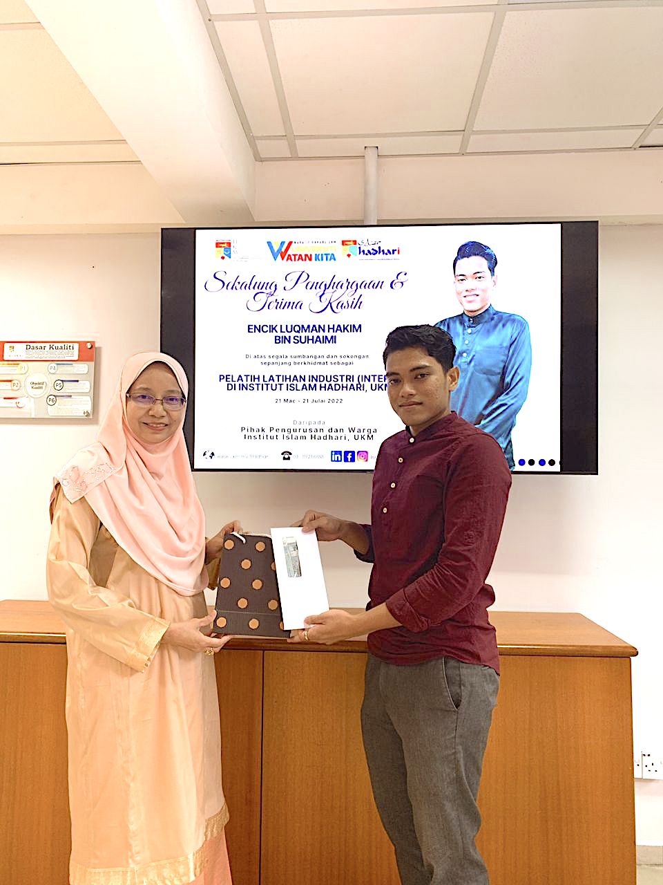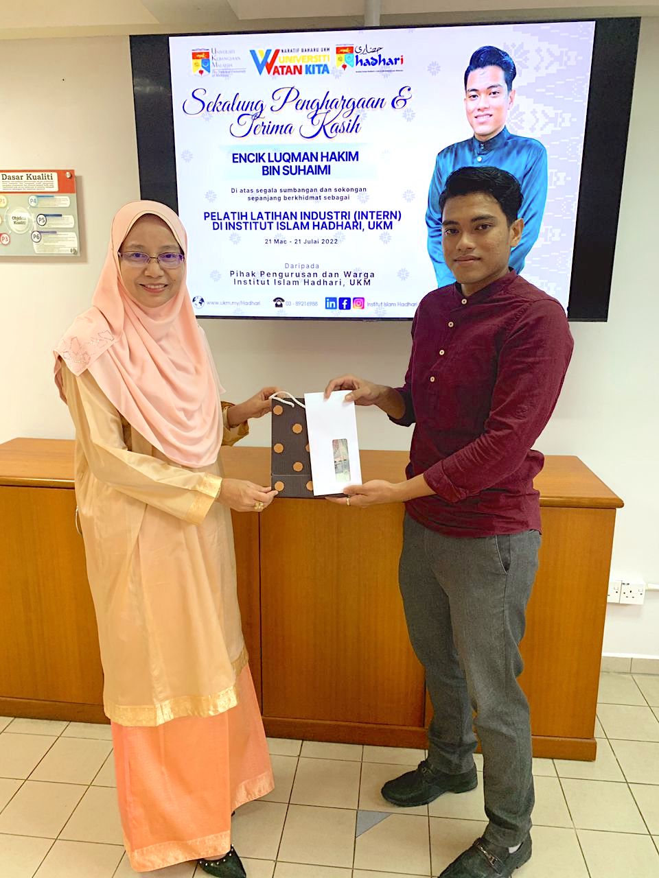 Majlis Penghargaan kepada Pelajar Latihan Industri, Encik Luqman Hakim bin Suhaimi (FEP, UKM) yang berjaya menamatkan latihan industri pada 21 Julai 2022. Moga apa yang dipelajari sepanjang menjalani latihan industri di HADHARI dapat diaplikasikan dalam bidang kerjaya yang akan diceburi nanti. Kami di HADHARI mendoakan saudara Luqman terus maju dan berjaya. Terima kasih & moga bertemu lagi di lain masa, Insha Allah