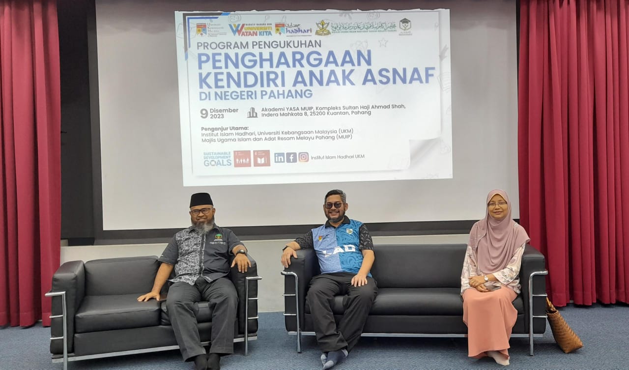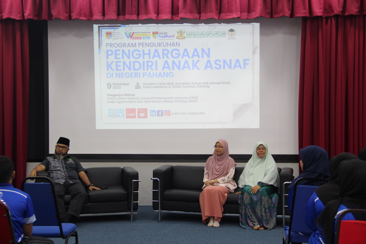Alhamdulillah, kerjasama Institut Islam Hadhari (HADHARI), Universiti Kebangsaan Malaysia (UKM) dengan Majlis Ugama Islam dan Adat Resam Melayu Pahang (MUIP) diperkukuhkan lagi dengan penganjuran bersama Program Pengukuhan Penghargaan Kendiri Anak Asnaf di Negeri Pahang. Program ini telah berlangsung pada 08 sehingga 09 Disember 2023, bertempat di Akademi YASA MUIP, Kompleks Sultan Haji Ahmad Shah, Kuantan, Pahang. Ia juga dianjurkan dengan kerjasama pensyarah dan pelajar Universiti Islam Pahang Sultan Ahmad Shah (UniPSAS) yang turut dilantik sebagai penceramah serta fasilitator. Tujuan program ini diadakan adalah untuk membantu anak-anak asnaf di Pahang memantapkan penghargaan kendiri mereka supaya mereka dapat menjadi generasi kedua yang berdikari dan memantapkan jaringan Institut Islam Hadhari dengan komuniti setempat. Program bermula pada 08 Disember 2023 dengan sesi lawatan di sekitar Akademi YASA-MUIP bagi penentuan tempat untuk aktiviti eksplorasi dan sebelah malam pula sesi taklimat bersama para penceramah, fasilitator dan ahli jawatankuasa. Penceramah dan fasilitator adalah pensyarah, pelajar dan pegawai dari UKM dan UniPSAS.