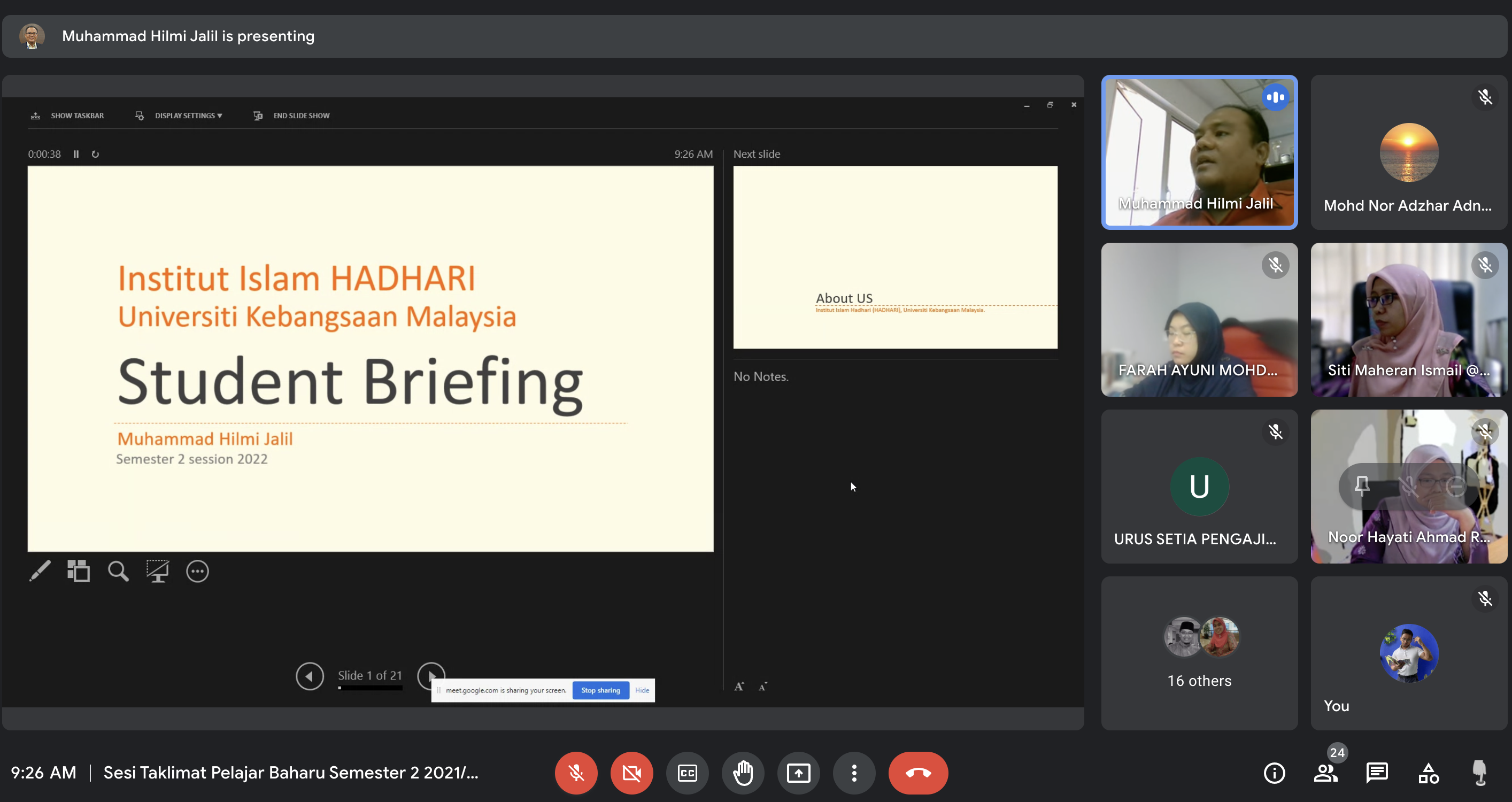 Alhamdulillah, on 30 Mac 2022, a briefing for new intake student semester 2 2021/2021 has been held successfully via Google Meet with a new total of 9 student who attended.