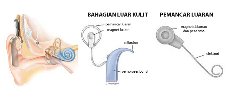 Seperti alat bantu dengar, terdapat satu mikrofon kecil di dalam pemproses bunyi yang akan menerima bunyi dan menukarkannya kepada maklumat digital. Berbeza dari alat bantu dengar, maklumat ini akan dihantar melalui koil ke implan yang diletakkan di bawah kulit. Implan kemudiannya menghantar signal-signal eletrik ini melalui elektrod-elektrod di dalam koklea dan seterusnya dihantar ke otak untuk