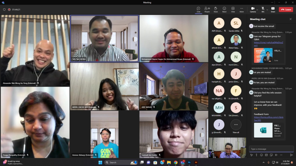 Seramai 38 pelajar UKM telah turut serta dalam sesi UKM x YTL Foundation Scholarship Infosession yang telah diadakan pada 17 April secara dalam talian. Pelajar telah diberikan informasi mengenai tatacara permohonan biasiswa YTL Foundation serta kelebihan dan peluang pekerjaan bersama YTL Foundation.