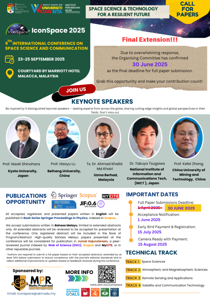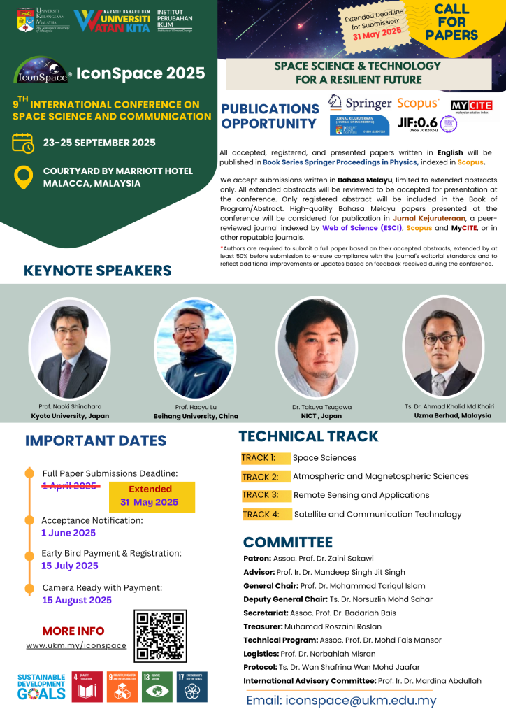 We are pleased to announce that the 9th International Conference on Space Science and Communication (IconSpace 2025) with the theme “Space Science & Technology for a Resilient Future”, will be held on 23-25 September 2025 in Courtyard Melaka, Malaysia.