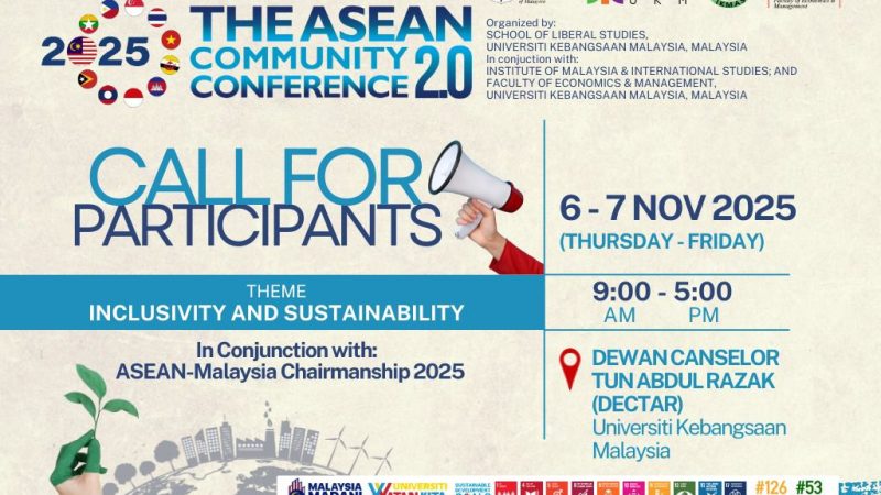 ASEAN Community Conference 2.0 Theme: Inclusivity and Sustainability In Conjunction with: ASEAN-Malaysia Chairmanship 2025 Date: 12-13 November 2025 (Wednesday-Thursday) Location: Bilik Senat, Universiti Kebangsaan Malaysia, 43600, …