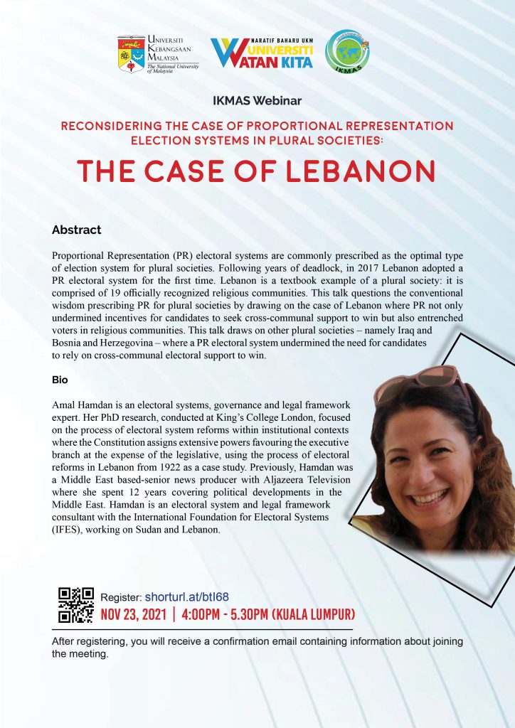 Proportional Representation (PR) electoral systems are commonly prescribed as the optimal type of election system for plural societies. Following years of deadlock, in 2017 Lebanon adopted a PR electoral system for the first time. Lebanon is a textbook example of a plural society: it is comprised of 19 officially recognized religious communities. This talk questions the conventional wisdom prescribing PR for plural societies by drawing on the case of Lebanon where PR not only undermined incentives for candidates to seek cross-communal support to win but also entrenched voters in religious communities. This talk draws on other plural societies – namely Iraq and