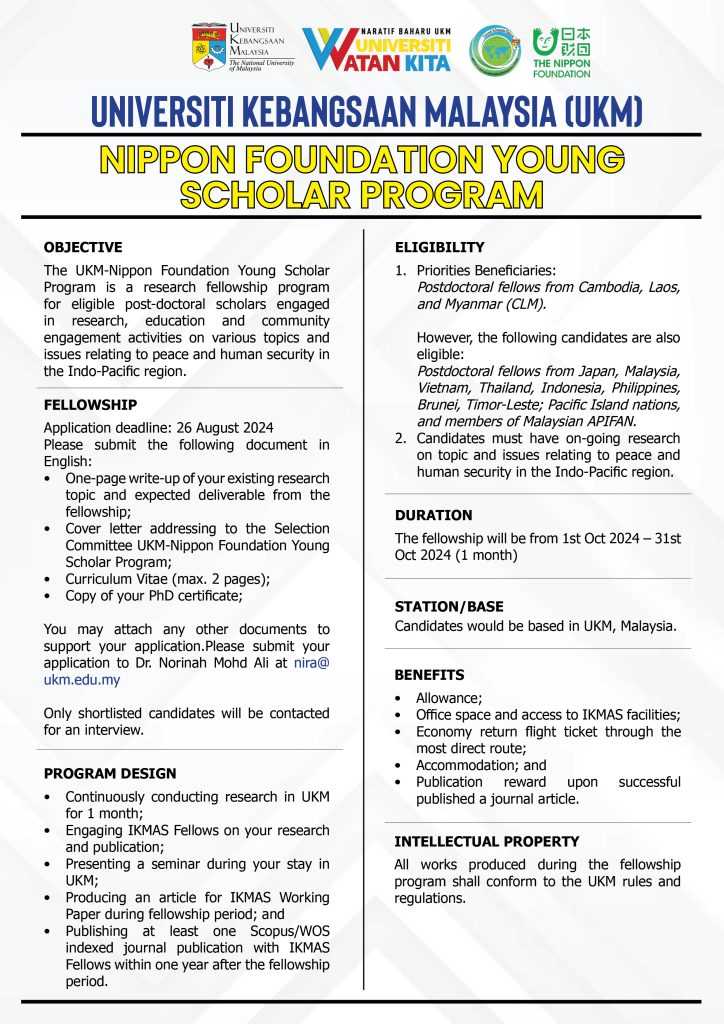 The UKM-Nippon Foundation Young Scholar Program is a research fellowship program for eligible post-doctoral scholars engaged in research, education and community engagement activities on various topics and issues relating to peace and human security in the Indo-Pacific region.