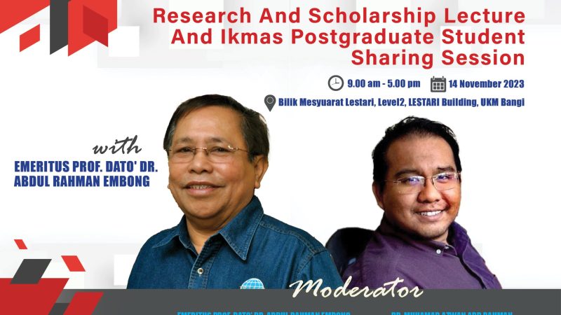 “RESEARCH AND SCHOLARSHIP LECTURE FOLLOWED BY IKMAS POSTGRADUATE STUDENT. SHARING SESSION WITH EMERITUS PROFESOR DATO’ DR. ABDUL RAHMAN EMBONG”