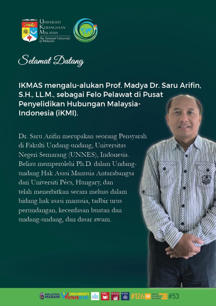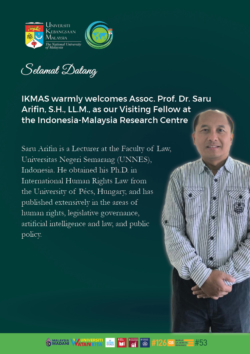 IKMAS mengalu-alukan , S.H., LL.M., sebagai Felo Pelawat di Pusat Penyelidikan Hubungan Malaysia-Indonesia (iKMI). Dr. Saru Arifin merupakan seorang Pensyarah di Fakulti Undang-undang, Universitas Negeri Semarang (UNNES), Indonesia. Beliau memperolehi Ph.D. dalam Undang-undang Hak Asasi Manusia Antarabangsa dari Universiti Pécs, Hungary, dan telah menerbitkan secara meluas dalam bidang hak asasi manusia, tadbir urus perundangan, kecerdasan buatan dan undang-undang, dan dasar awam.