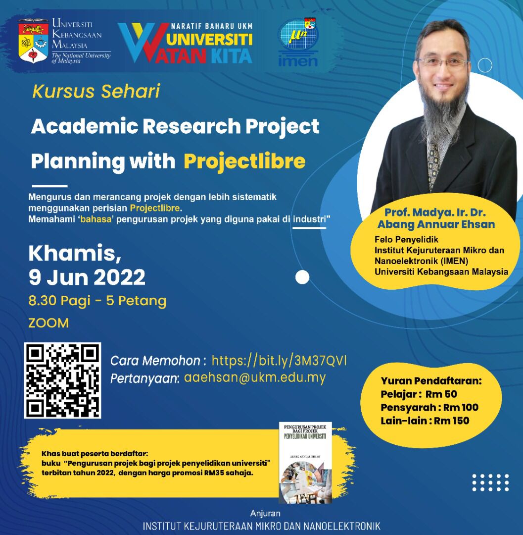 Kursus ini bertujuan memberi pendedahan kepada peserta berkaitan topik pengurusan projek terutama projek akademik di universiti. Modul kursus telah dibangunkan bagi memudahkan peserta memahami konsp-konsep asas di dalam pengurusan dan perancangan projek serta membolehkan mereka melihat bagaimana suatu jadual projek dapat dibangunkan dengan menggunakan suatu alat penjadualan projek opensource, ProjectLibre.
