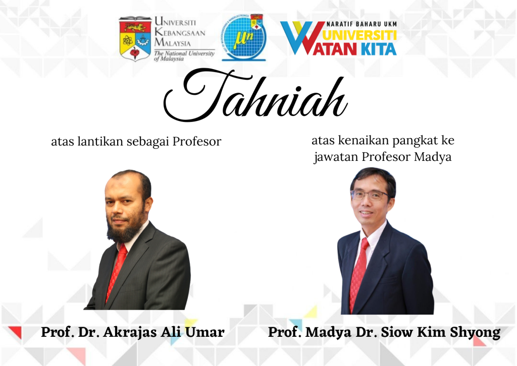 Congratulation to Prof Akrajas & Assoc. Prof. Siow We would like to congratulate Prof. Dr. Akrajas Ali Umar for the appointment as a Professor and Assoc. Prof. Dr. Siow Kim Shyong for the promotion to Assoc. Prof.