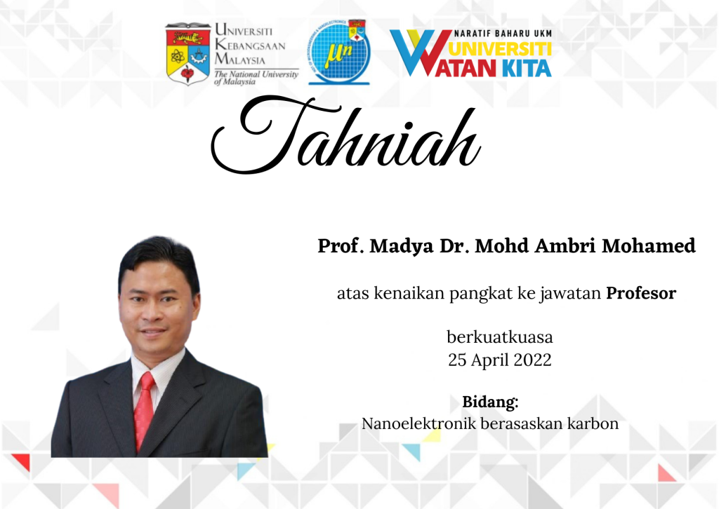 Promotion to Professor Congratulation to Assoc. Prof. Dr. Mohd Ambri Mohamed for the promotion to Professor effective from 25 April 2022. His expertise is on carbon-based nanoelectronics.