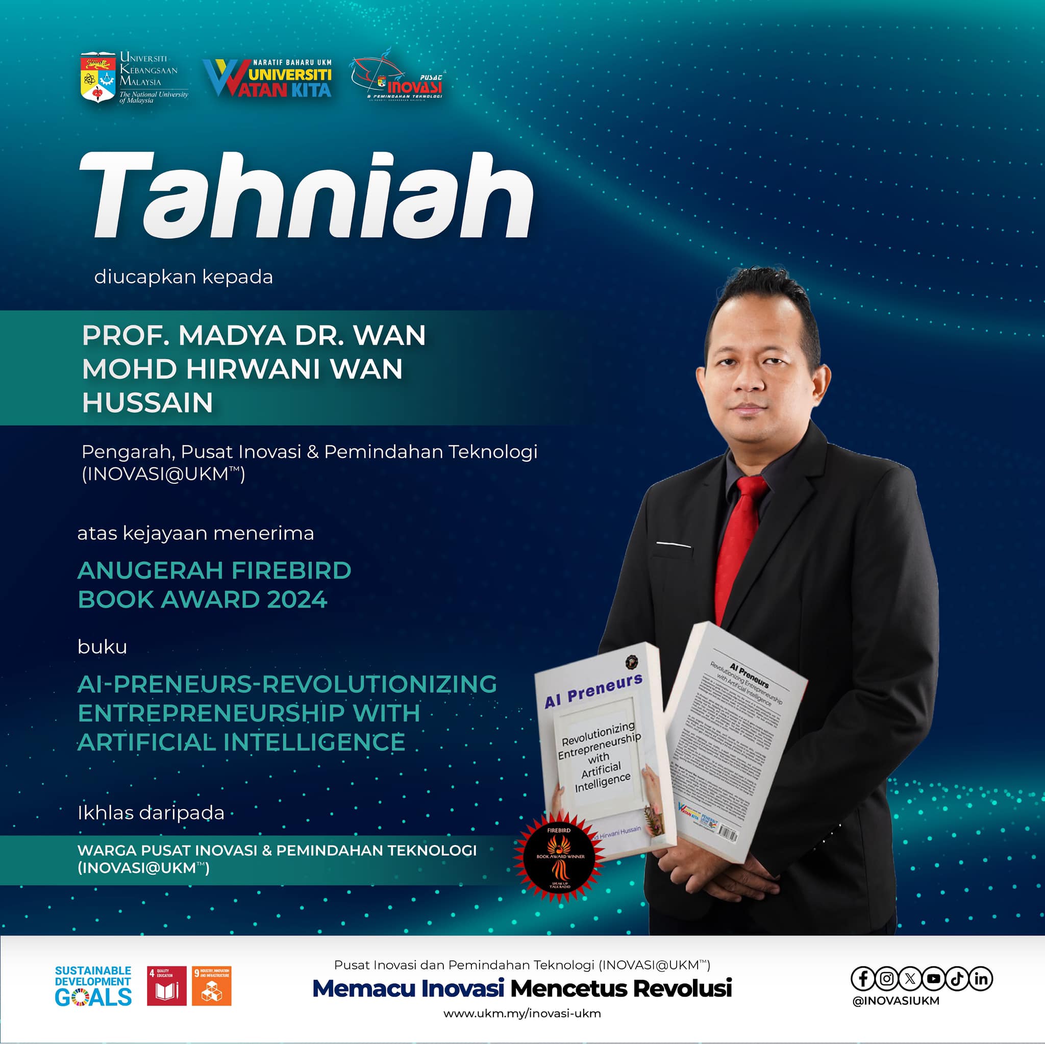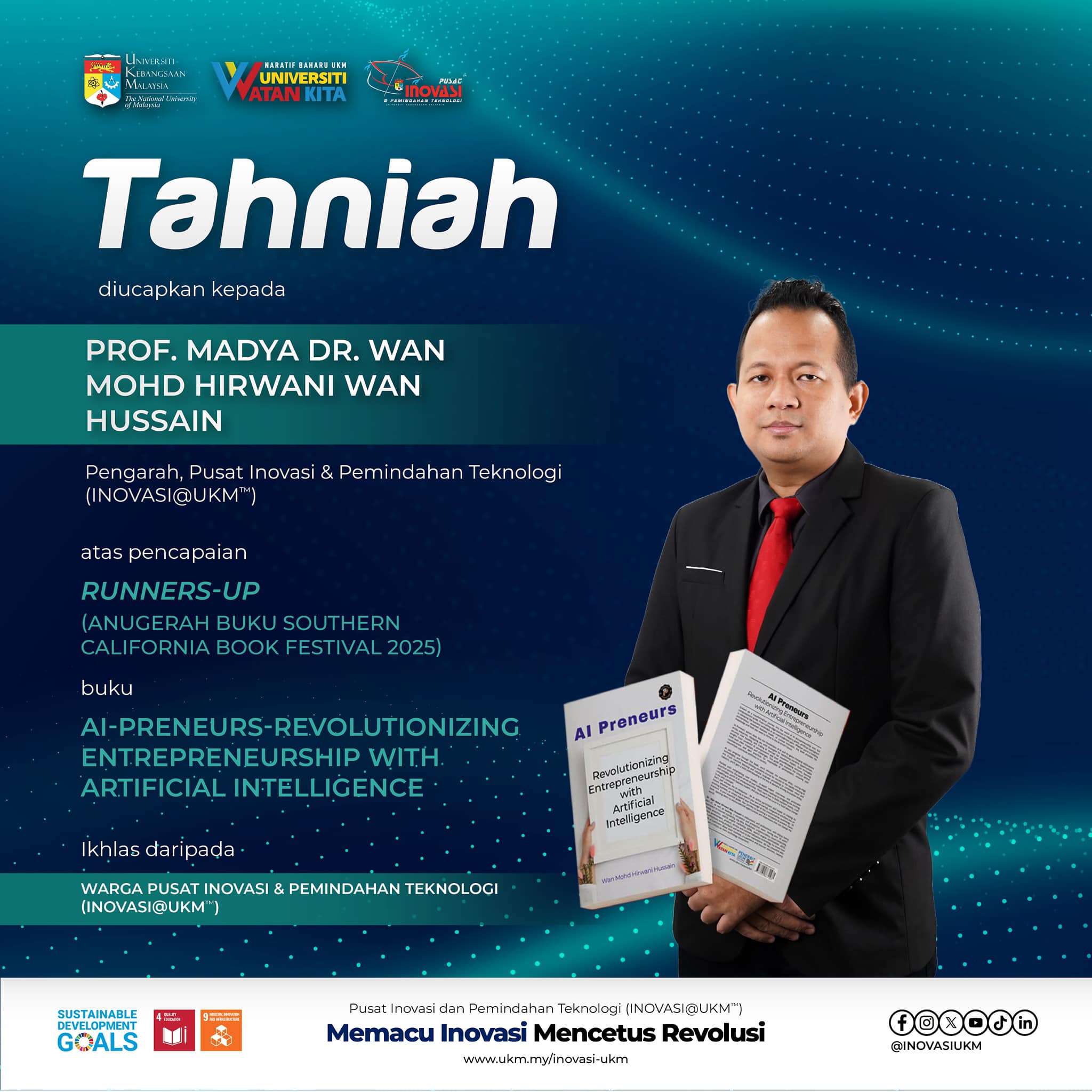 The Centre for Innovation and Technology Transfer (INOVASI@UKM) proudly extends our heartiest congratulations to our Director, YBrs. Prof. Madya Dr. Wan Mohd Hirwani Wan Hussain, for his remarkable success in winning the Firebird Book Award 2024 and securing the Runners-Up Award in the Business/Technology category at the Southern California Book Festival 2025 for his book, AI-Preneurs – Revolutionizing Entrepreneurship with Artificial Intelligence, published by Penerbit UKM.