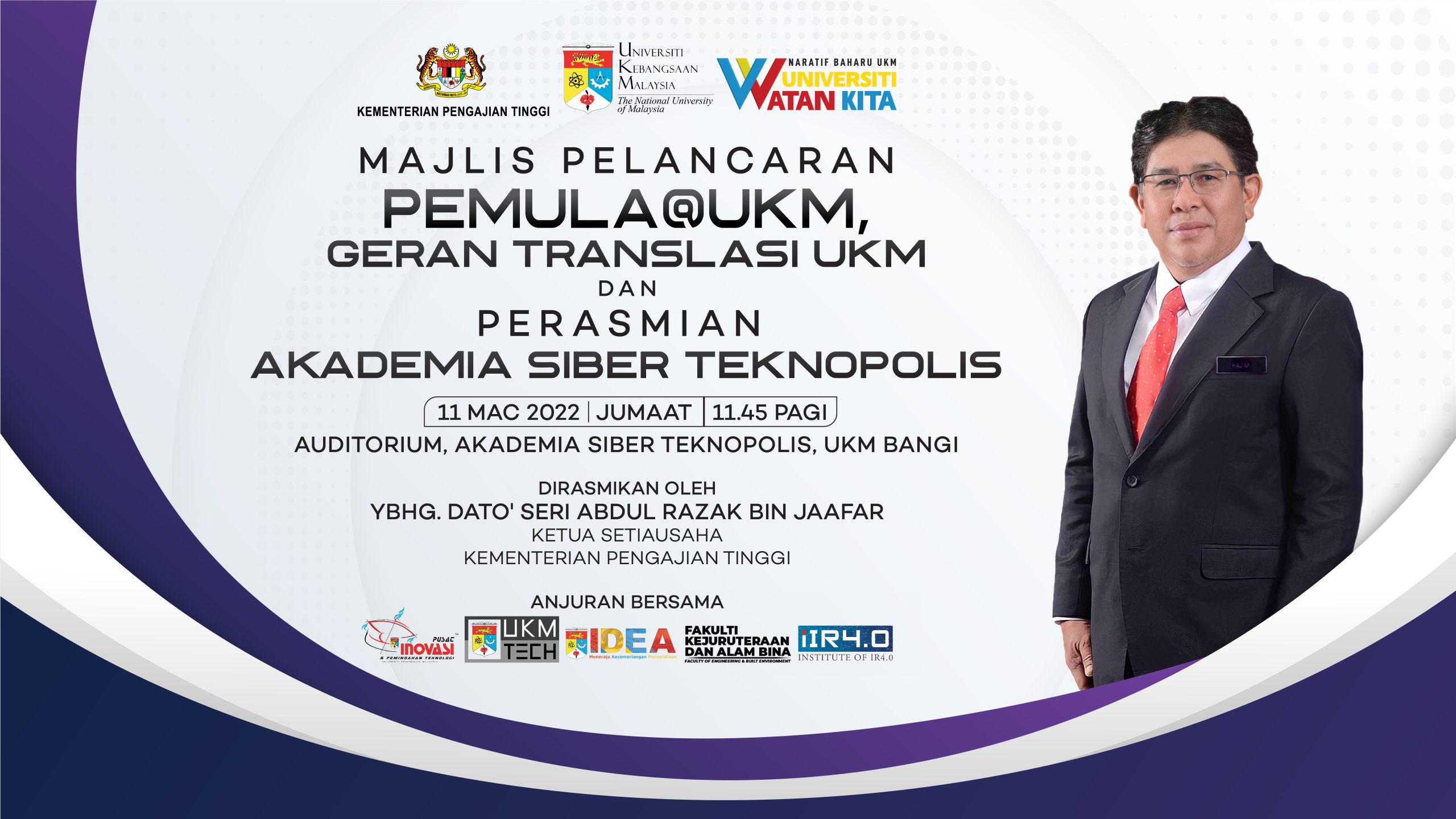 Pusat Inovasi dan Pemindahan Teknologi (INOVASI@UKM) akan mengadakan Majlis Pelancaran Pemula@UKM, Geran Translasi UKM Dan Perasmian Akademia Siber Teknopolis (AST). Majlis ini akan dirasmikan oleh YBhg. Dato’ Seri Abdul Razak bin Jaafar, Ketua Setiausaha, Kementerian Pengajian Tinggi Malaysia seperti berikut:-