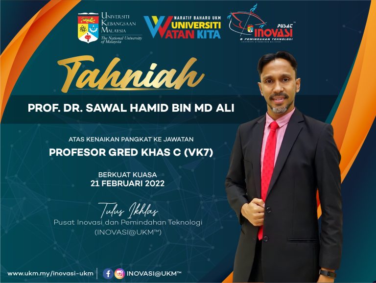 Seluruh warga Pusat Inovasi dan Pemindahan Teknologi (INOVASI@UKM™️) mengucapkan setinggi-tinggi penghargaan dan ucapan tahniah kepada Prof. Dr. Sawal Hamid Bin Md Ali di atas kenaikan pangkat ke jawatan Profesor Gred Khas C (VK7) berkuat kuasa pada 21 Februari 2022