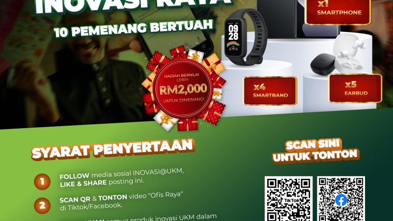 Dah tengok video “Ofis Raya” INOVASI@UKM? Jom sertai Peraduan Cari & Menang Inovasi Raya. Jadi antara 10 PEMENANG BERTUAH! Hadiah menarik menanti anda:📱 1x Smartphone…