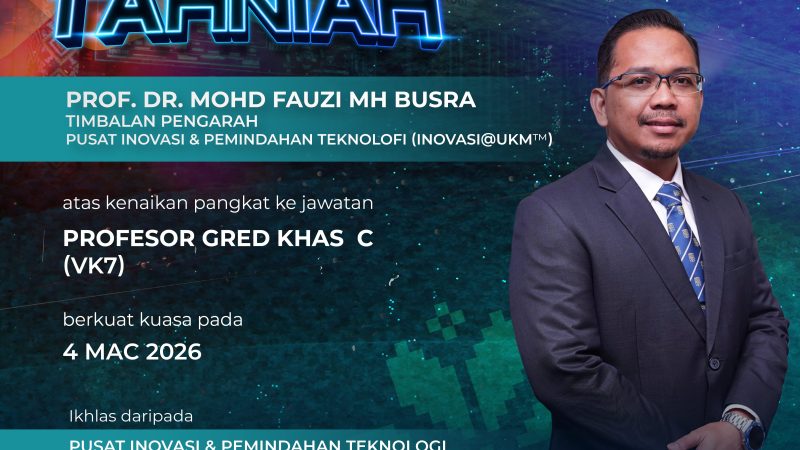 Sekalung tahniah diucapkan kepada Prof. Dr. Mohd Fauzi MH Busra, Timbalan Pengarah Pusat Inovasi & Pemindahan Teknologi (INOVASI@UKM™) atas kenaikan pangkat ke jawatan Profesor Gred…