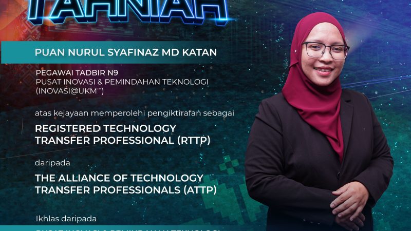 Sekalung tahniah diucapkan kepada Puan Nurul Syafinaz Md Katan, Pegawai Tadbir N9, Pusat Inovasi & Pemindahan Teknologi (INOVASI@UKM™) atas kejayaan memperoleh pengiktirafan sebagai Registered Technology…
