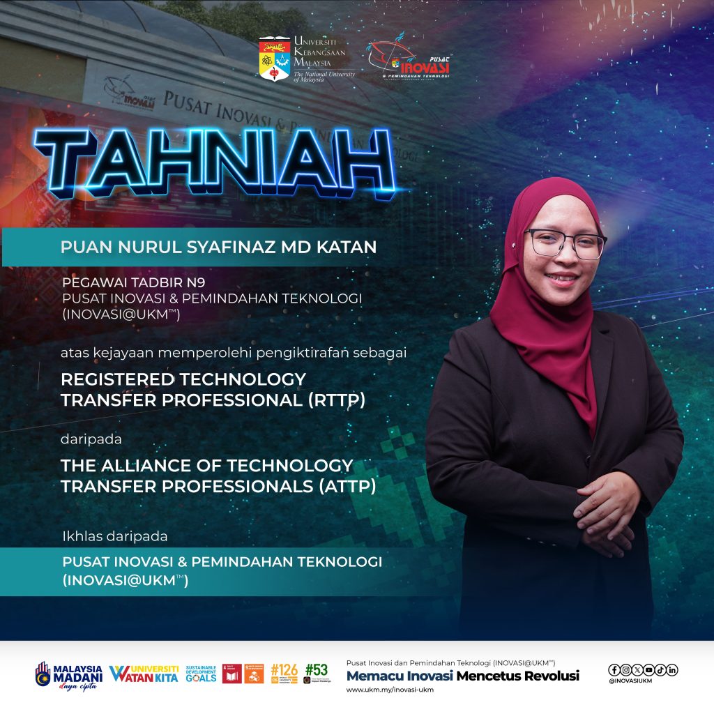 Sekalung tahniah diucapkan kepada Puan Nurul Syafinaz Md Katan, Pegawai Tadbir N9, Pusat Inovasi & Pemindahan Teknologi (INOVASI@UKM™) atas kejayaan memperoleh pengiktirafan sebagai Registered Technology Transfer Professional (RTTP) daripada The Alliance of Technology Transfer Professionals (ATTP).