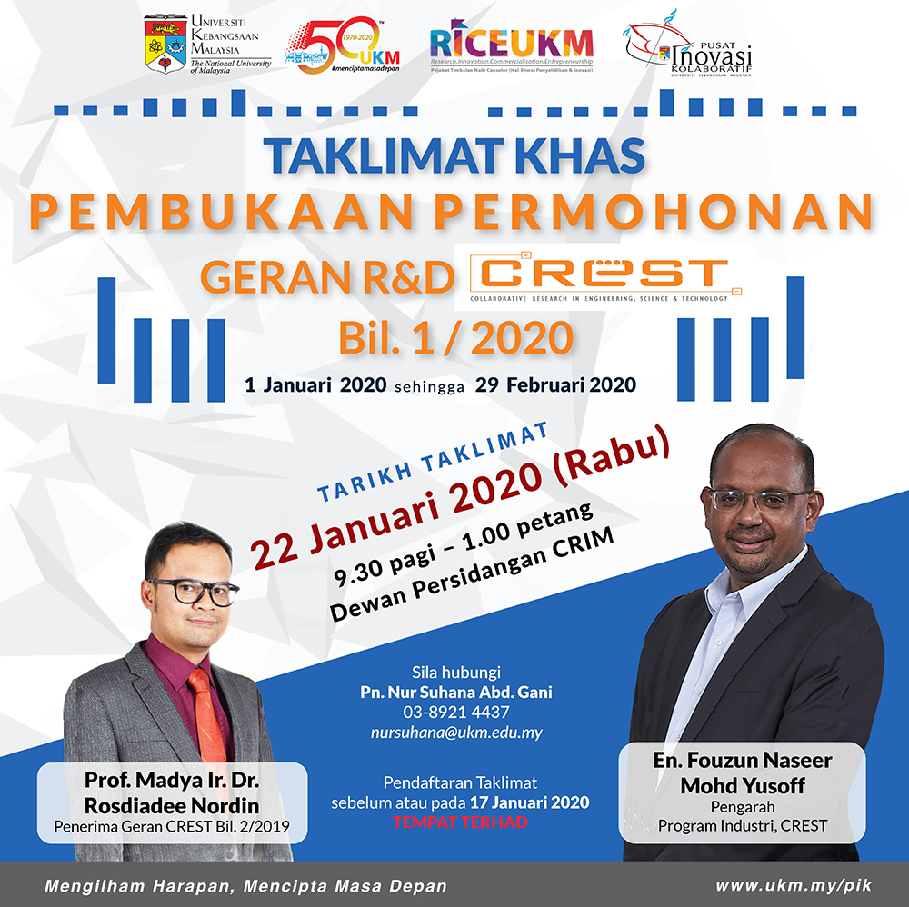 Sesi Taklimat Pembukaan Permohonan Geran R&D CREST Bil.1/2020 akan diadakan pada 22 Januari 2020 di Dewan Persidangan CRIM,UKM Bangi. Tempoh Pembukaan Pembukaan Permohonan Geran R&D …