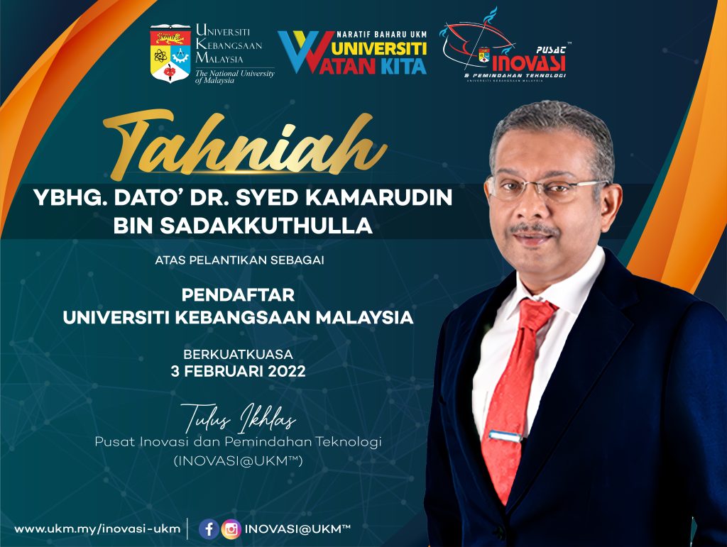 Seluruh warga Pusat Inovasi dan Pemindahan Teknologi (INOVASI@UKM™) menyampaikan SETINGGI-TINGGI PENGHARGAAN & UCAPAN TAHNIAH kepada YBHG. DATO’ DR. SYED KAMARUDIN BIN SADAKKATHULLA di atas pelantikan sebagai Pendaftar Universiti Kebangsaan Malaysia mulai 3 Februari 2022.