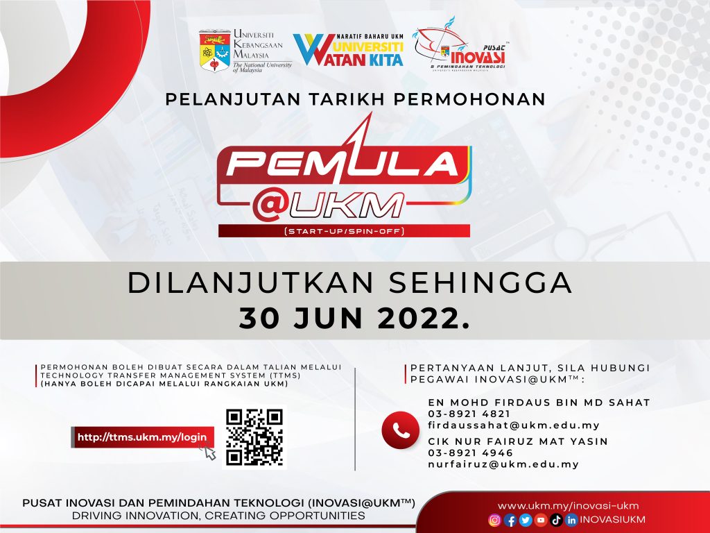 Adalah dimaklumkan bahawa tempoh bagi permohonan Program Pemula@UKM (Start-up/Spin-Off) telah dilanjutkan sehingga 30 Jun 2022 bagi memberi peluang kepada warga UKM yang ingin membuka syarikat berteraskan teknologi dan kepakaran.
