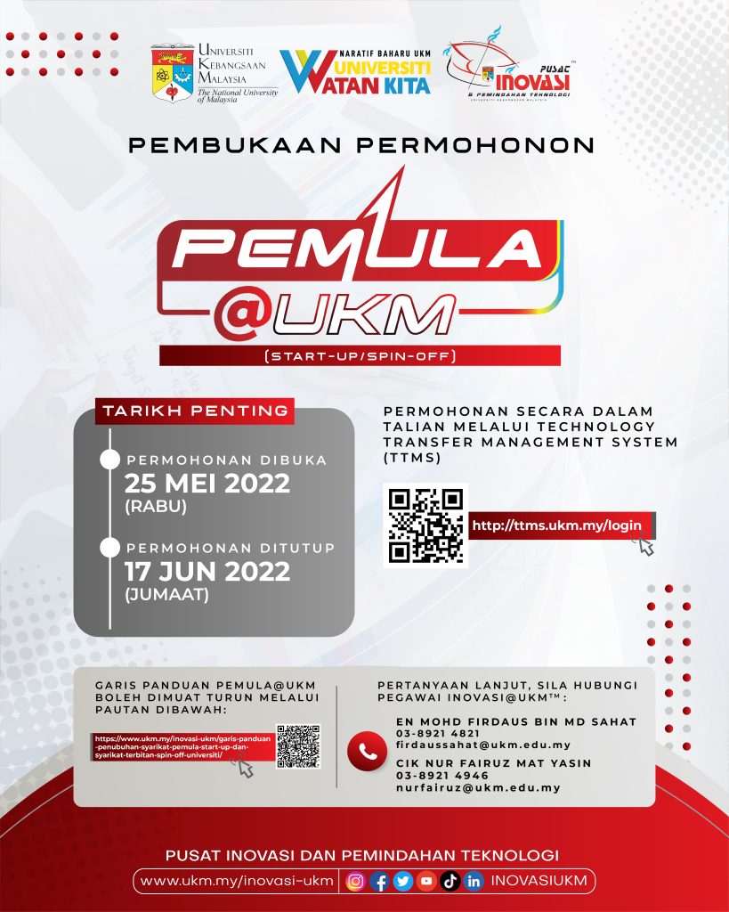 🚩Adalah dimaklumkan bahawa Pusat Inovasi & Pemindahan Teknologi (INOVASI@UKM™️) akan membuka permohonan bagi Program PEMULA@UKM untuk tahun 2022.