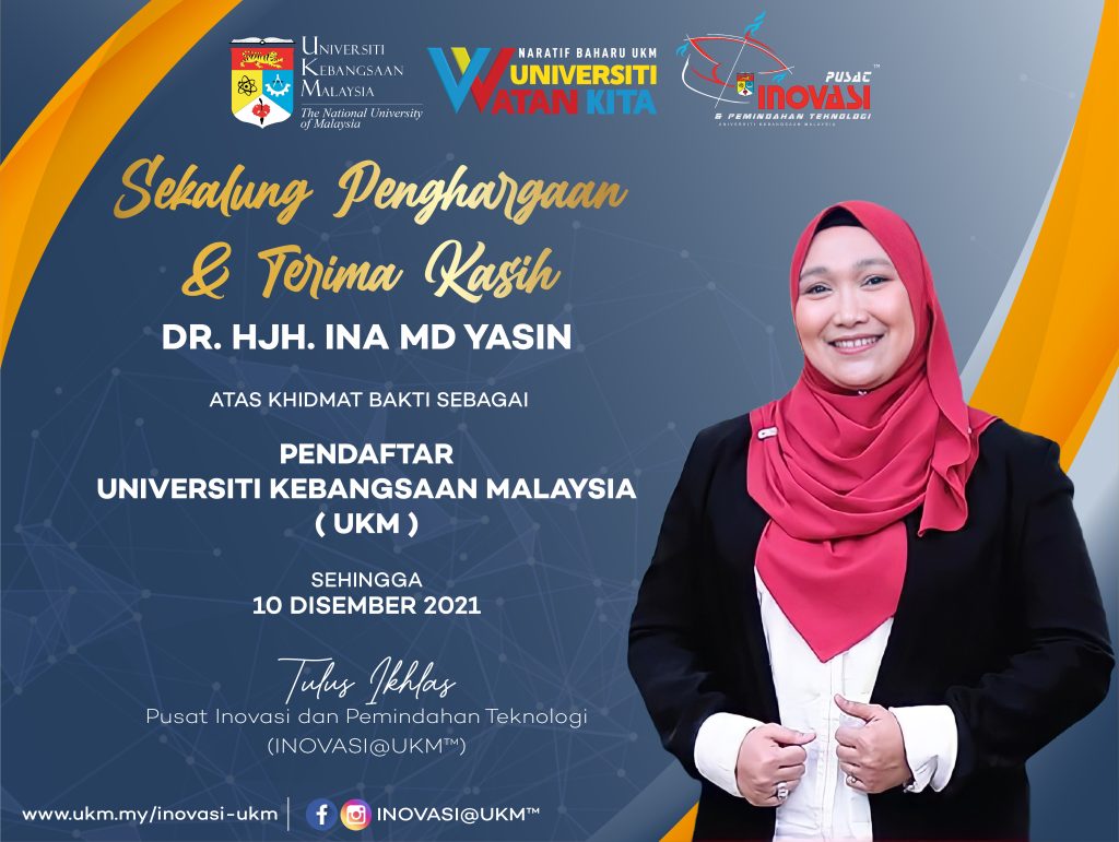 Seluruh warga Pusat Inovasi dan Pemindahan Teknologi (INOVASI@UKM™) menyampaikan SETINGGI-TINGGI PENGHARGAAN TERIMA KASIH kepada Dr. Hjh Ina Md Yasin di atas segala khidmat bakti sebagai Pendaftar Universiti Kebangsaan Malaysia sehingga 10 Disember 2021.