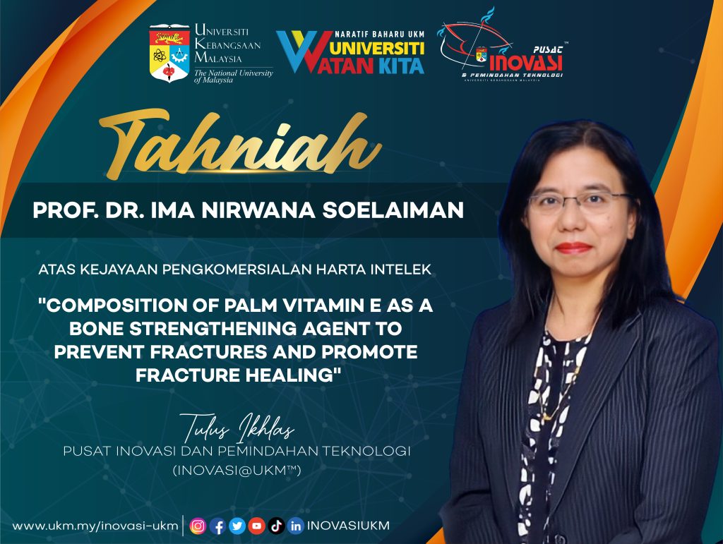 Tahniah diucapkan kepada pasukan penyelidik yang diketuai oleh Prof. Dr. Ima Nirwana Soelaiman atas kejayaan pengkomersialan harta intelek “COMPOSITION OF PALM VITAMIN E AS A BONE STRENGTHENING AGENT TO PREVENT FRACTURES AND PROMOTE FRACTURE HEALING” kepada syarikat ONE MEDS SDN. BHD. pada 5 Julai 2022 yang lalu.