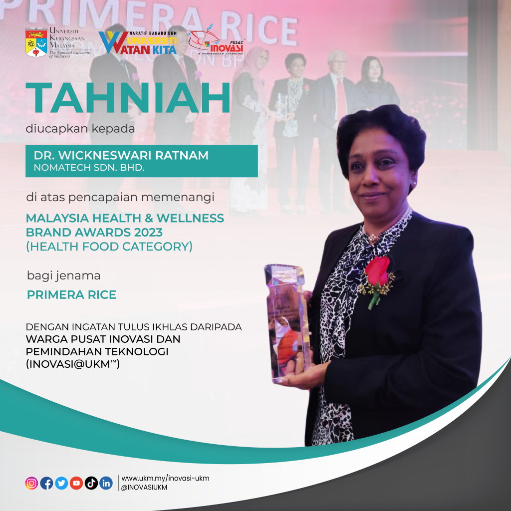 Congratulations to the team of Dr. Wickneswari a/p Ratnam on the achievement of the BERAS PRIMERA brand winning the “MALAYSIA HEALTH & WELLNESS BRAND AWARDS 2023” in the “HEALTH FOOD” category. The award presentation took place at a splendid ceremony on November 15, 2023, at the Imperial Ballroom, One World Hotel, Petaling Jaya. The event was organized by Sin Chew Daily, Lifestyle Magazine, and Sin Chew Healthcare. Also in attendance was the Minister of Health, Dr. Zaliha binti Mustafa.