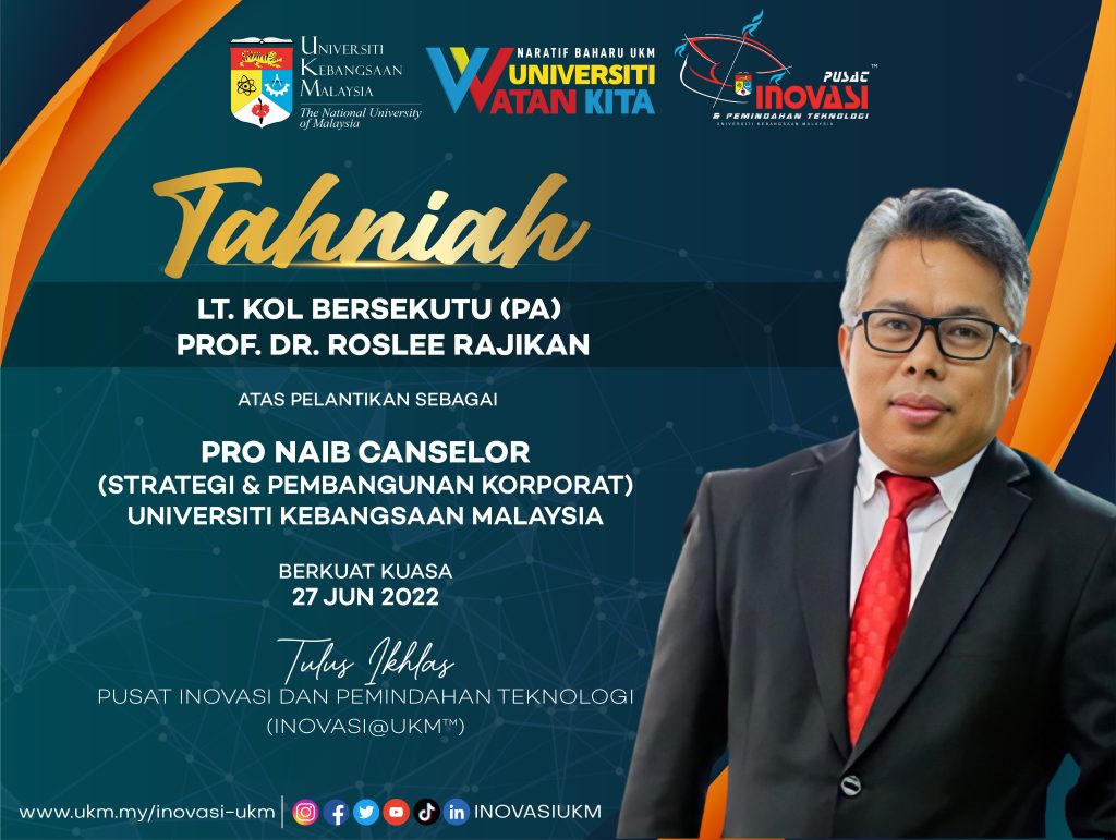Seluruh warga Pusat Inovasi dan Pemindahan Teknologi UKM ingin mengucapkan setinggi-tinggi tahniah kepada YBhg. Lt. Kol Bersekutu (PA) Prof. Dr. Roslee Rajikan di atas pelantikan sebagai Pro Naib Canselor (Strategi dan Pembangunan Korporat) Universiti Kebangsaan Malaysia berkuat kuasa 27 Jun 2022.