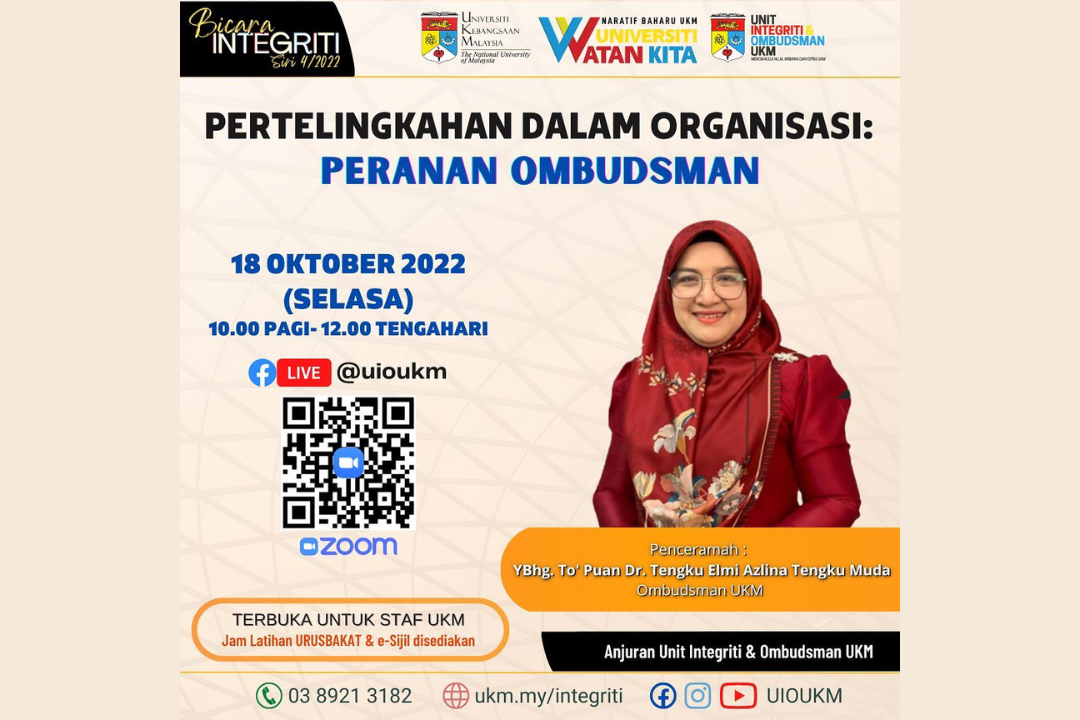 Unit Integriti & Ombudsman telah menganjurkan Bicara Integriti Siri 4/2022: “Pertelingkahan dalam Organisasi: Peranan Ombudsman” yang disampaikan oleh YBhg. To’ Puan Dr. Tengku Elmi Azlina Tengku Muda, Ombudsman UKM.Rakaman langsung Bicara Integriti Siri 3/2022 boleh disaksikan di pautan https://fb.watch/qKvIfplf4P/.
