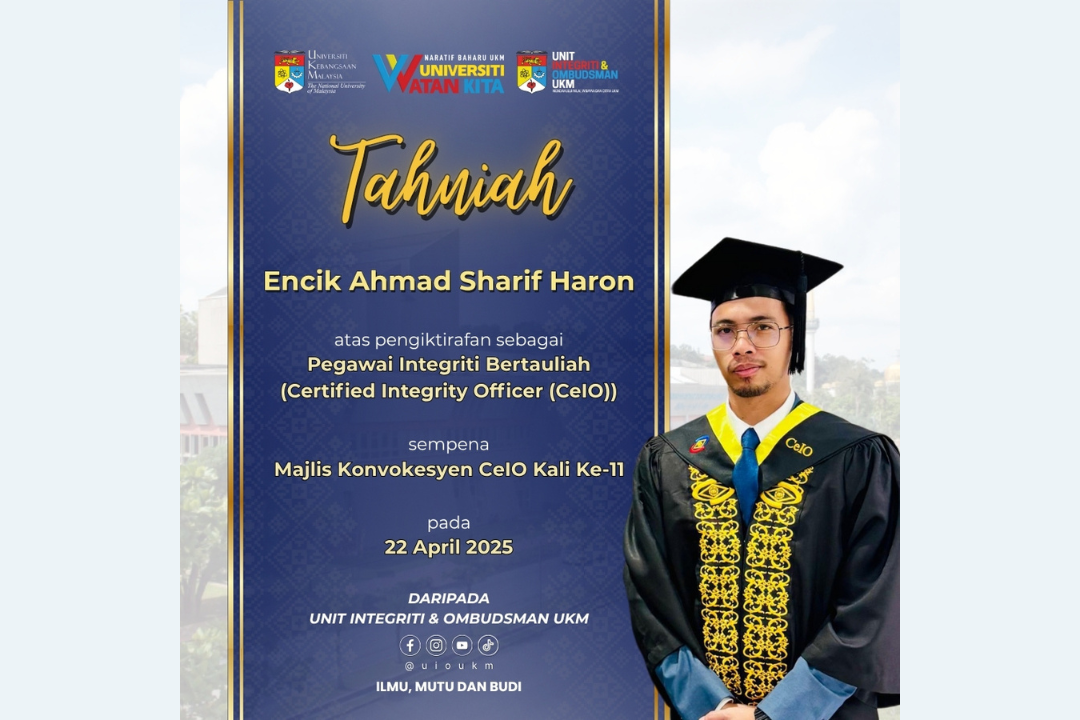 Unit Integriti & Ombudsman mengucapkan setinggi-tinggi tahniah kepada Encik Ahmad Sharif Haron, Penolong Pendaftar, Unit Integriti & Ombudsman UKM atas pengiktirafan sebagai Pegawai Integriti Bertauliah (Certified Integrity Officer (CeIO)) sempena Majlis Konvokesyen CeIO Kali Ke-11 anjuran Akademi Pencegahan Rasuah Malaysia (MACA) bertempat di Dewan Tun Dr Ismail, Pusat Dagangan Dunia Putra (PWTC), Kuala Lumpur pada 22 April 2025.