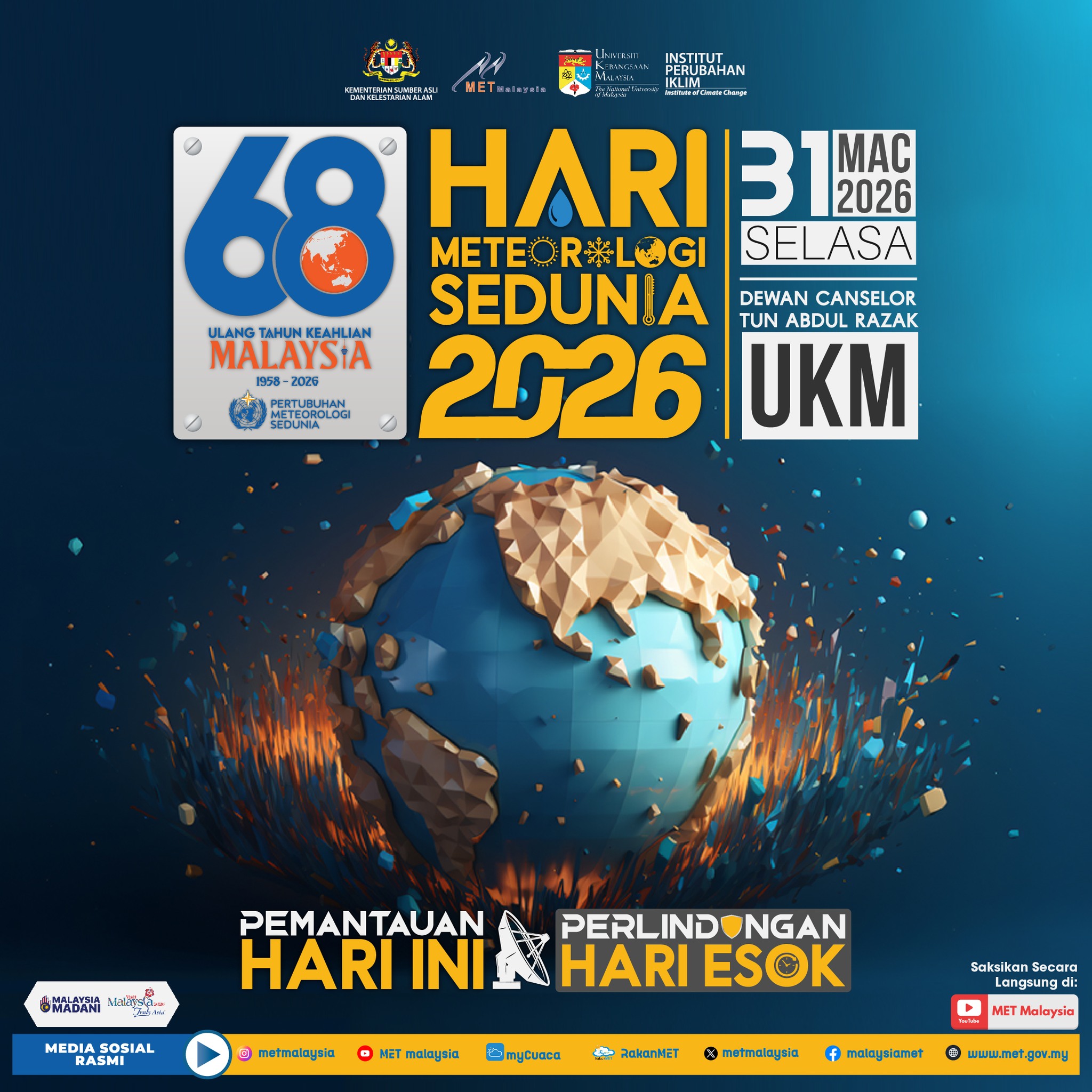 Jabatan Meteorologi Malaysia (MET Malaysia) akan menganjurkan sambutan Hari Meteorologi Sedunia 2026 dan memperingati ulang tahun ke-68 keahlian Malaysia dalam Pertubuhan Meteorologi Sedunia (WMO)seperti ketetapan berikut: