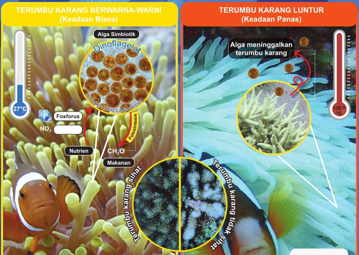 Peningkatan suhu permukaan laut telah memberikan kesan negatif kepada organisma marin air cetek seperti batu karang di terumbu karang. Keadaan ini mengakibatkan karang terpaksa mengeluarkan alga simbiotik, lalu menyebabkannya kehilangan sumber makanan.